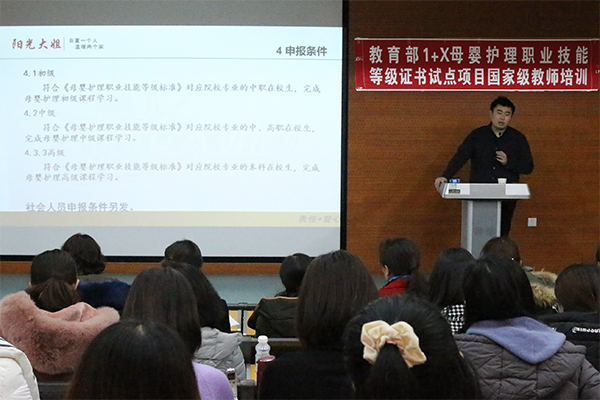 为贯彻落实国家和辽宁省职业教育改革实施方案精神,根据《教育部等四部门印发< 关于在院校实施“学历证书+若干职业技能等级证书”制度试点方案>的通知》、《教育部教师工作司关于组织开展1+X证书制度试点院校教师培训的通知》等文件要求,11月21日,由辽宁省教育厅主办,ylzzcom永利总站线路检测作为牵头院校承办的母婴护理专业辽宁省国培计划“1+X证书”制度试点院校教师培训班开班典礼在医疗护理分院隆重举行。学院党委委员、医疗护理分院院长李冬,教务处处长王新,医疗护理分院副院长姚文山、郭强,济南阳光大姐服务有限责任公司“1+X”证书项目负责人李凯主任出席了开班典礼,李冬院长在开班典礼上做开班动员。本次培训历时7天,共有来自全省20家兄弟院校的59名学员参加培训,学院特邀相关领域6位专家进行授课。