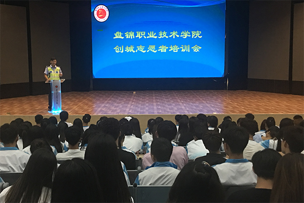 学院高度重视本次志愿服务活动,为保证志愿者清楚自己的岗位要求,了解志愿服务相关事项,学院于9月7日邀请盘锦市兴隆台区交警队相关负责领导对学生进行专业的培训和岗位职责简述及相关注意事项的讲解。台下的志愿者们认真听讲并做好听课笔记,或是拿手机拍下 PPT 内容。