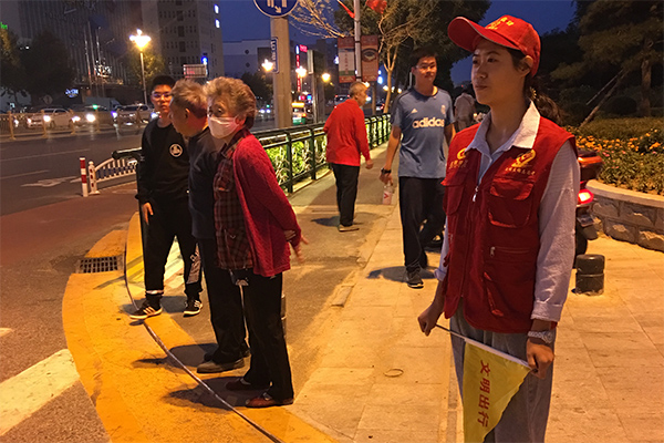 9月15日,学院 128 名志愿者踏上了志愿服务之路。志愿者分两人一组分别守在4个方向路口,挥举着文明交通小黄旗向行人、车辆发出指示,同时对非机动车和行人的越线停靠、不文明穿行马路等行为进行监督、劝阻。