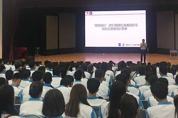 9月1日下午,志愿者开展赛前实战演练。青年志愿者身着整齐的运动服,不顾高温日晒,接受2017盘锦红海滩马拉松赛的医疗志愿者、裁判志愿者以及安保志愿者的业务培训。